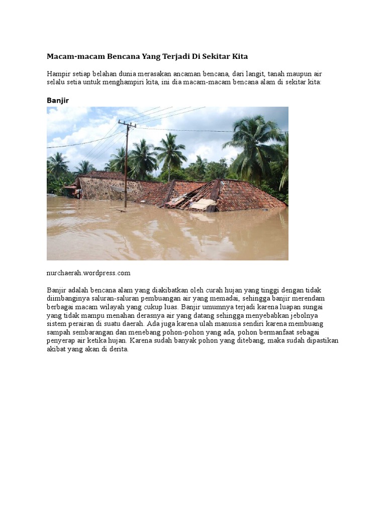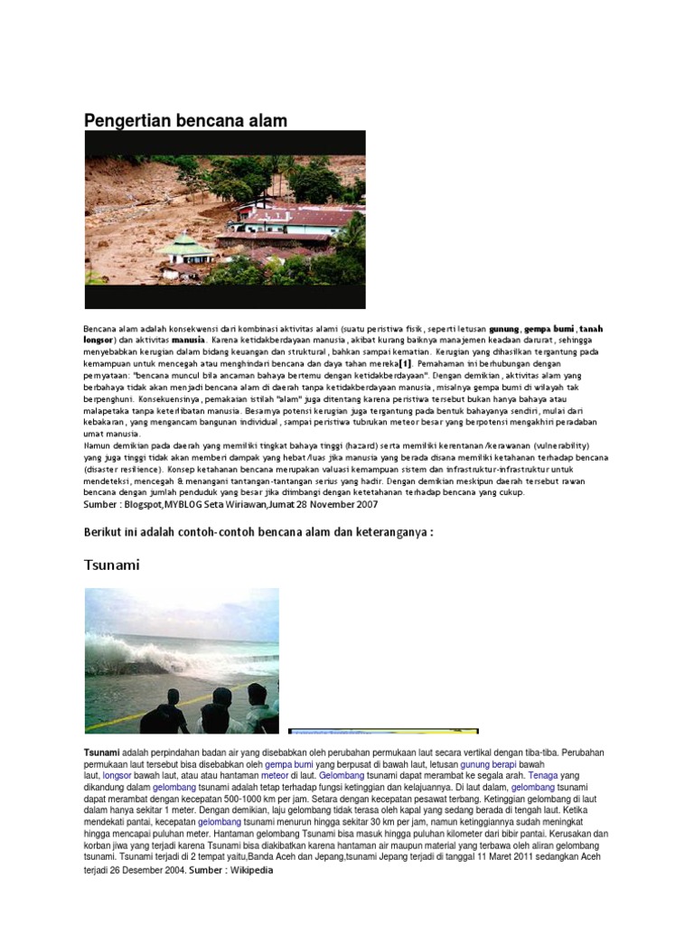 Akan tetapi bencana alam yang dilakukan oleh manusia adalah bencana alam yang terjadi akibat ulah manusia. Selain itu, bencana alam dapat terjadi karena ada faktor campur. If you want to learn bencana alam in english, you will find the translation here, along with other translations from indonesian to english. Bencana appun bentuknya tentunya sangat merugikan bagi manusia, dengan seiring perkembangan teknologi saat ini manusia sudah bisa memprediksi terjadinya suatu bencana alam. 0 ratings0% found this document useful (0 votes).
