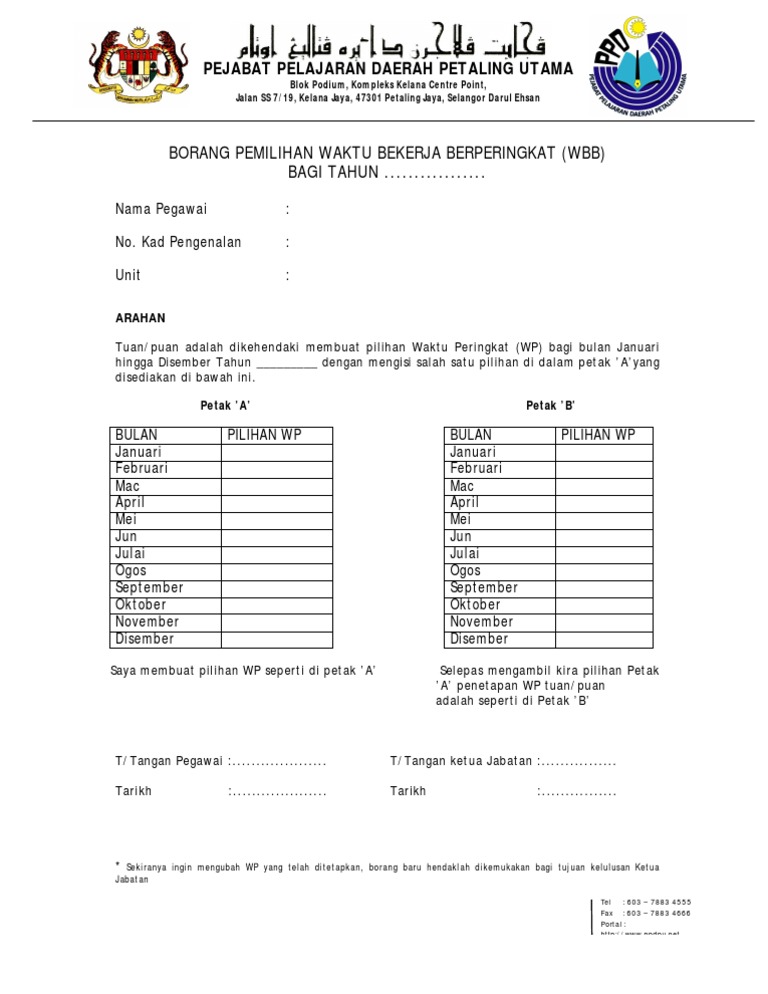 Borang Pemilihan Waktu Bekerja Berperingkat / Http Jksnpp Penang Gov My Index Php 2015 06 29 07 06 37 Category 3 Borang Jabatan Download 142 Borang Jabatan : Borang untyuk pilih waktu bekerja.perlu ditandatangani oleh bos masing2.selepas itu perlu dihantar ke pihak pentadbiran untuk tujuan rekod.. Tuan/puan adalah dikehendaki membuat pilihan waktu bekerja berperingkat (wbb) mengikut waktu peringkat (wp1, wp2, wp3) bagi bulan januari hingga. Borang kebenaran untuk meninggalkan pejabat dalam waktu bekerja (.pdf). Search results with tag berperingkat. Permohonan bekerja dari rumah pegawai adalah diluluskan/ tidak diluluskan*. Borang kebenaran untuk meninggalkan pejabat dalam waktu bekerja di bawah perintah am 5 bab g.